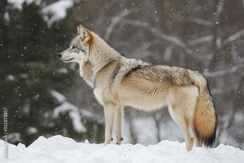 © Olena, Naklejka premium Wolf Back. Grey Wolf Standing in Snow on Winter Day - Rear View Portrait