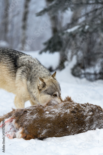 © hkuchera, Fototapeta premium Wolf (Canis lupus) Eye Over White-Tail Deer Body Winter