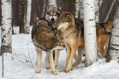 Fototapeta premium Wolf (Canis lupus) Pack Together Middle One Snarling Winter