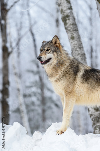 © hkuchera, Obraz premium Wolf (Canis lupus) Stands Looking Left in Front of Frost Forest Winter