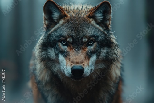 © Oleksandr, Obraz premium Wolf emerges from thick fog, revealing its piercing gaze in a mysterious forest setting