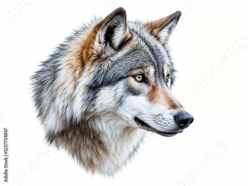 © NexusGallery, Obraz premium Wolf head portrait looking forward against a white background displaying fur texture