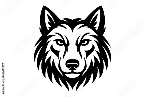 © Jakzui, Naklejka premium Wolf head vector logo for sport mascot or tattoo. Fierce wild animal emblem. Black and white canine predator illustration. Isolated wildlife symbol for graphic design projects.