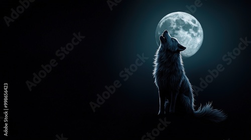© Chano_1_na, Obraz premium Wolf howling against a full moon, dark background.