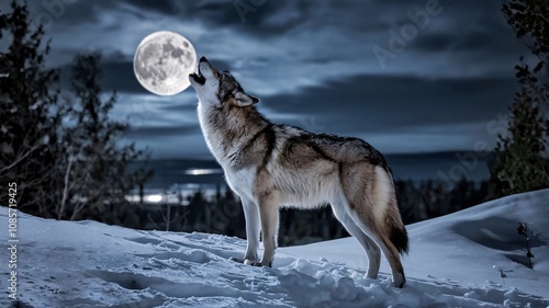 © Rijal, Fototapeta premium Wolf Howling at Moon in Snowy Forest Night Scene
