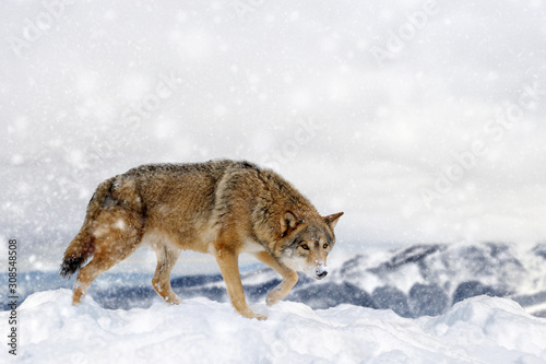 Fototapeta premium Wolf in a snow on winter background