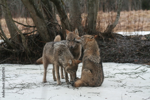 Obraz premium Wolf in autumn-winter forest near river, pond and swamp