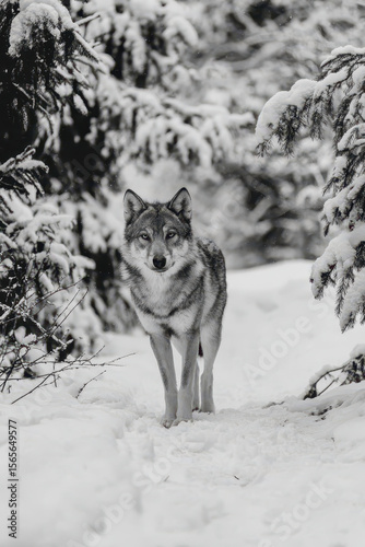 Fototapeta premium Wolf in Snowy Forest: Monochrome