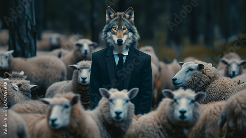 Fototapeta premium Wolf in suit standing in a heard of sheep