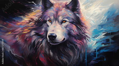Naklejka premium Wolf, long ethereal hair, impressionistic brush strokes, amidst an abstract...