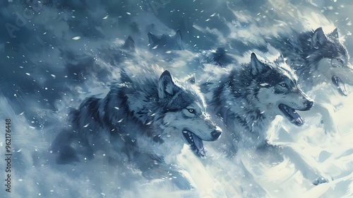 © Beer AI, Obraz premium Wolf Pack Running Through Snowstorm