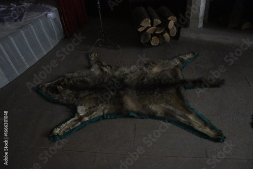 Obraz premium Wolf pelt rug displayed on the floor near a fireplace with stacked wood,...
