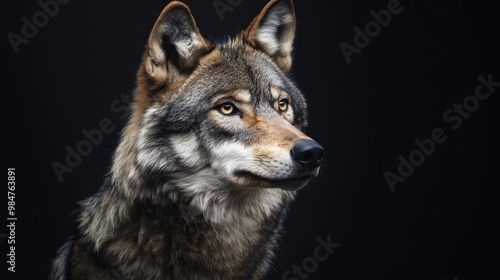© BerkahStock, Fototapeta premium Wolf Portrait Against Black Background