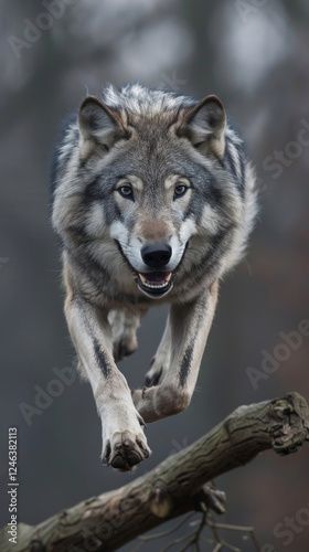 Fototapeta premium Wolf run along a path in the forest and jumping over a fallen tree. Wild animal.