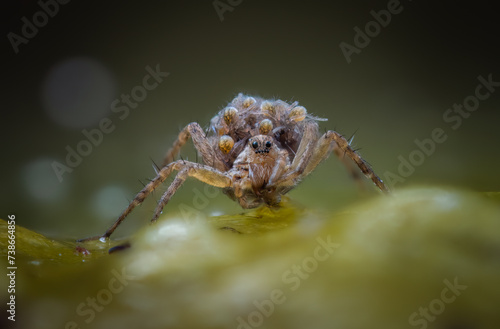© Vlasto Opatovsky, Fototapeta premium Wolf Spider (Pardosa amentata) with spiderlings on back.