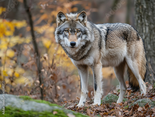 Obraz premium Wolf standing in autumn forest with fallen leaves and yellow foliage.
