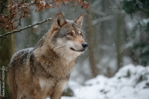Fototapeta premium Wolf standing in snow-covered forest, showcasing winter beauty in a realistic...