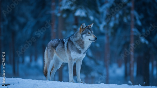 © Ozgurluk Design, Fototapeta premium Wolf Standing in Snowy Forest at Dusk