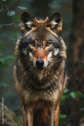 Fototapeta premium Wolf standing in the forest, its piercing eyes glowing
