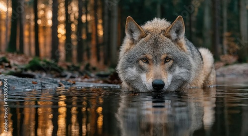 Fototapeta premium Wolf Standing in Water With Forest Background, Depicting Wildlife...