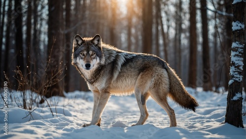 © Igor, Naklejka premium wolf standing on a forest path in winter close-up