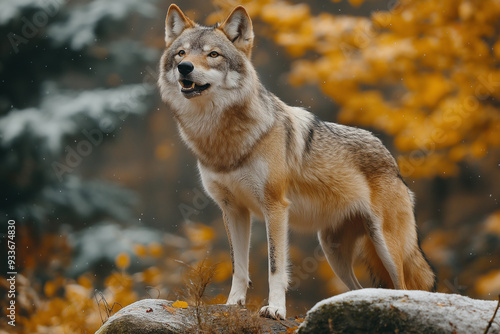 Fototapeta premium Wolf standing on rocks in a forest.
