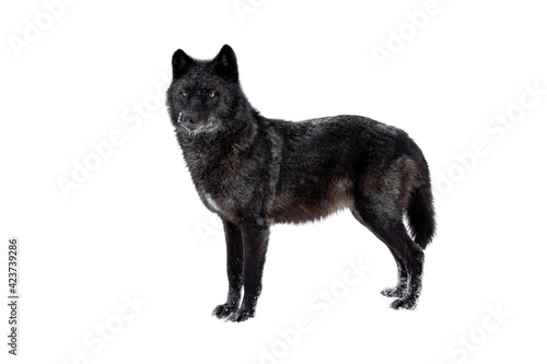 © fotomaster, Obraz premium wolf stands during snowfall isolated on white background