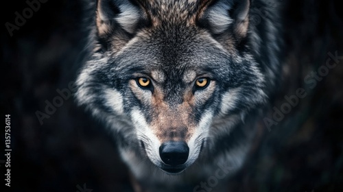 Fototapeta premium Wolf staring intently forest environment wildlife photography dramatic...