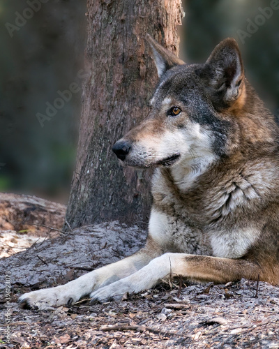© Aline, Fototapeta premium Wolf stock photos. Red Wolf head shot close-up profile view displaying brown fur, head, with a blur background in its environment and habitat. Wolf Image. Picture. Portrait. Endangered species.