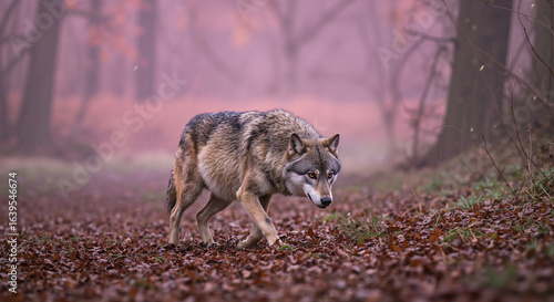 © Svetlana Borisova, Fototapeta premium Wolf walking in autumn forest with mist
