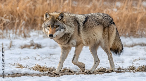 Naklejka premium Wolf Walking in Snowy Landscape Surrounded by Grass and Brush