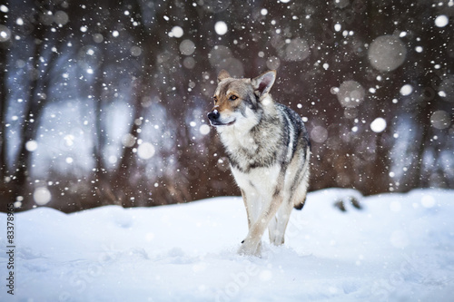 © martinjan, Fototapeta premium wolfdog wolking in the snow