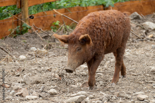 Fototapeta premium Wollschwein Mangalica mit gekräuseltem, lockigen Fell