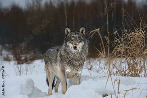 © adventure, Naklejka premium Wolves in Chernobyl radioactivity region running among abandoned hoses with cold winter and deep snow