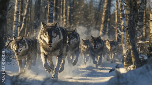 © jirasin, Fototapeta premium Wolves Running Through a Snowy Forest Landscape