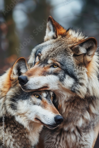 Naklejka premium Wolves tender moment. Wildlife photography, nature documentaries, themes of love and companionship.