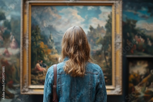 © ATH'HAR Art Ai, Fototapeta premium Woman admires painting in a museum gallery.