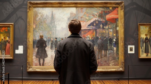 Naklejka premium Woman admiring a painting of a city street in a museum
