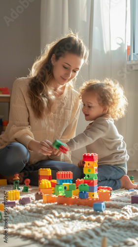 Fototapeta premium Woman and child building with colorful blocks on a rug