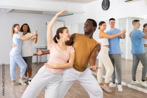 Naklejka premium Woman and man practicing bachata dance moves in pair during group class