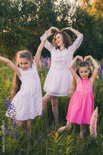 © Kiryakova Anna, Fototapeta premium Woman and two girls together in a field with lupins