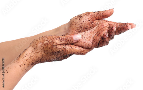Fototapeta premium Woman applying body scrub onto her hands on white background, closeup