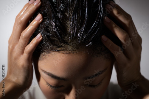 © xuxu, Naklejka premium Woman applying conditioner on wet dark hair. Hair care, treatment, and beauty routine. Skincare, health, hygiene concept.