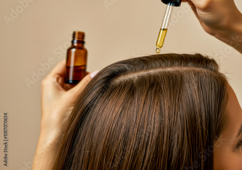 Fototapeta premium Woman applying hair oil with a dropper to nourish and strengthen her hair...