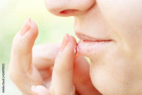 © Andrii, Obraz premium woman applying lip balm. outdoor, blurred green background. authentic photo. side view. skin care concept.