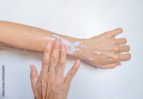 © yongyut, Fototapeta premium Woman applying moisturizing cream on her hands. Skin care concept.