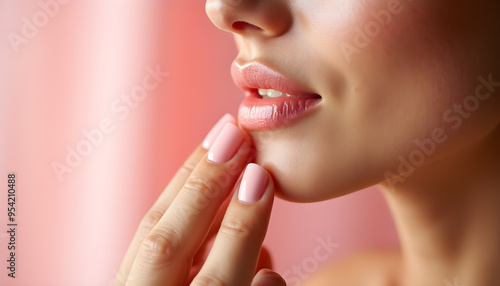 © Lee Design Arts, Fototapeta premium Woman Applying Soft Pink Cream to Cheek in Skincare Routine