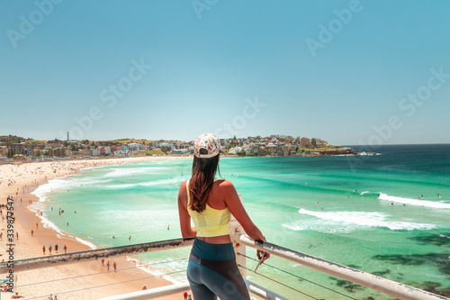 Fototapeta premium Woman at Bondi Beach, Sydney, Australia. Girl in work out gear looking at...