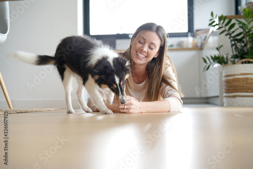 Obraz premium Woman at home sittign on floor with puppy dog