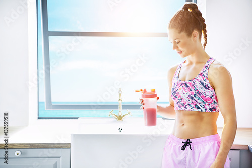 © Flamingo Images, Obraz premium Woman at kitchen with glass of smoothie